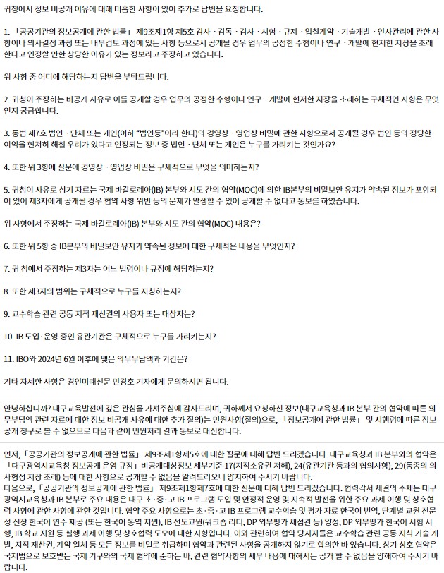 경인미래신문이 대구교육청에 IBO와 맺은 협약과 관련에 비공개(관련기사, 경인미래신문 2025년 1월 16일자 '대구교육청이 ‘IBO에 지급한 47억 여원 혈세’ 비공개... '부당거래' 의심') 처리하자 그 이유에 대해 구체적인 질의를 했다.